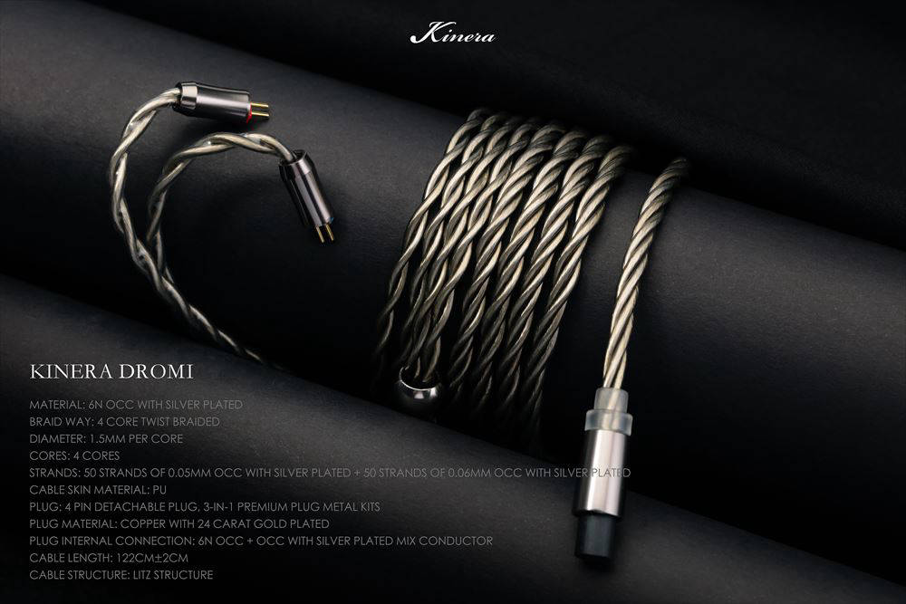 DROMIはコンパクトな交換式プラグデザインを採用しており、24金メッキを施した2.5mm、3.5mm、4.4mmの銅製プラグを用意し、市場で人気のあるプレーヤーの合わせ簡単に交換することができます。 内部接続には4ピン6N OCCと銀メッキミックス導体のOCCを採用し、オーディオ信号をより安定的かつ迅速に伝送できるようにしています。 またKineraカスタマイズの0.78mm2pinと、mmcxプラグは高い耐用度を備えています。